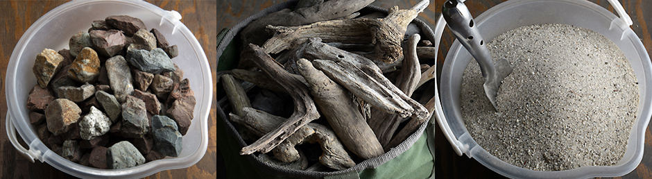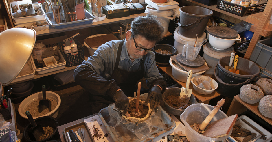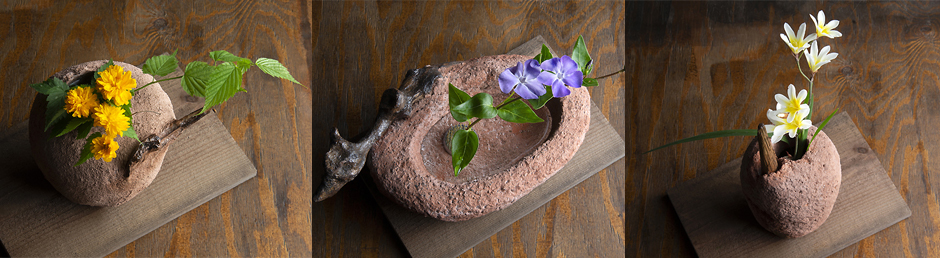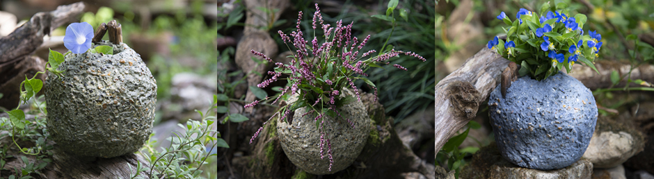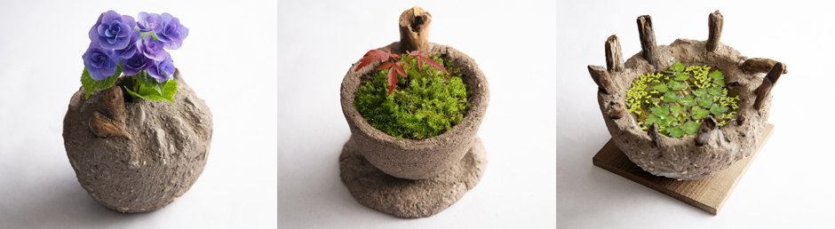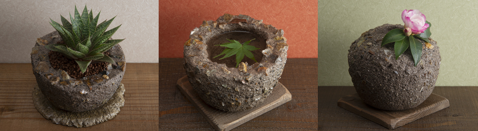 同じ形のものは一つと無い流木や石に導かれるようにして壺や鉢の全体像を決め、素材を砂とCementで固めながら形を作っていきます。