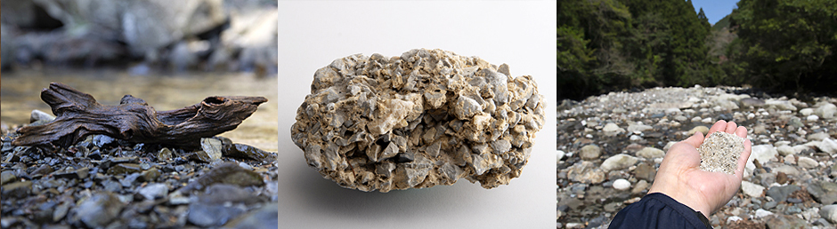 深山の樹木が長い年月とともに朽ちて、あるいは風雨のため倒木となって山の斜面を下り谷底に落ちます。そして谷川の急流に砕かれて大木が小さな木片となります。